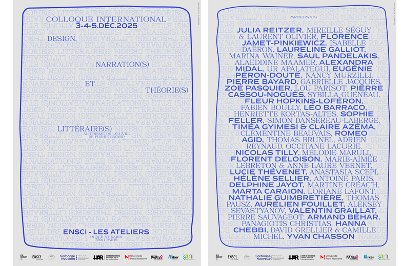 À la suite du colloque organisé à Chicago en 2024 autour de l’œuvre de Pierre Bayard, nous proposons de poursuivre nos échanges et nos réflexions autour des enjeux partagés par les designs spéculatifs/critiques, les pratiques narratives (littératures, cinéma, arts, jeux vidéos, …) et les théories littéraires, en organisant un colloque international qui se tiendra à l’École Nationale Supérieure de Création Industrielle, à Paris, du 3 au 5 décembre 2025. Cet évennement associe l'ENSCI les Ateliers - ENS Paris Saclay, (Centre de recherche en Design), l'Université Paris Nanterre (HAR), Sorbonne Nouvelle (CERAM), l'Université de Pau et des Pays de l’Adour (laboratoire IKER-UMR 547) et l'Université Paris 8.