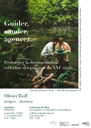 Du 3 au 4 novembre, le BiS accueille une exposition d’Olivier Troff, designer-chercheur au Centre de Recherche en Design. L’exposition accompagne sa thèse intitulée "Guider, sonder, agencer. Prototyper la documentation collective des paysages du XXIe siècle". Elle présente des dispositifs qui transforment notre manière d’observer et de comprendre les paysages actuels.