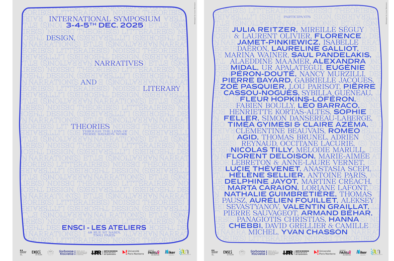 Following the symposium held in Chicago in 2024 on the work of Pierre Bayard, we propose to continue our discussions and reflections on the shared challenges of speculative/critical design, narrative practices (literature, film, art, video games, etc.), and literary theories by organizing an international symposium to be held at the École Nationale Supérieure de Création Industrielle (ENSCI) in Paris, from December 3 to 5, 2025. This event brings together ENSCI Les Ateliers, ENS Paris-Saclay (Design Research Center), Paris Nanterre University (HAR), Sorbonne Nouvelle (CERAM), the University of Pau and the Adour Region (IKER-UMR 547 laboratory), and Paris 8 University.